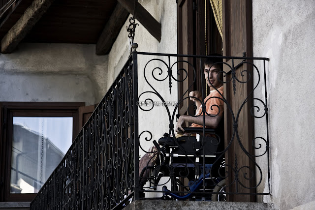 Poco più in la, da un balcone sulla nostra destra, aiutato dalla sua mamma, ci stava seguendo con lo sguardo un ragazzino diversamente abile seduto nella sua carrozzella di sempre, era eccitato e contento del nostro passaggio. Tutti passando lo salutavano e lui, con lo sguardo fiero e contento, piano piano ha alzato il braccio.